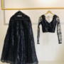 This stunning black lehenga set features intricate sequin detailing for a glamorous, sparkling look. The matching blouse has sheer, embroidered sleeves with a modern tie-back design. Perfect for evening events, it combines elegance and contemporary style.