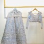 A luxurious blue lehenga featuring a rich combination of silver and pink embroidery. The structured blouse with long sleeves adds a touch of grace and is perfect for an evening celebration or special event.