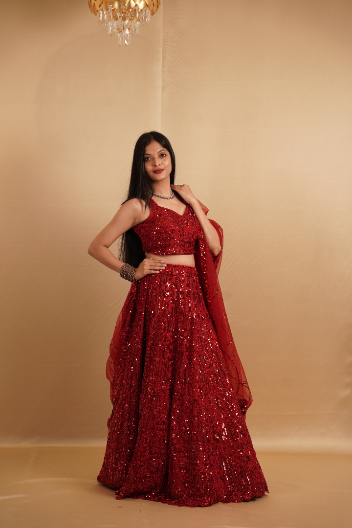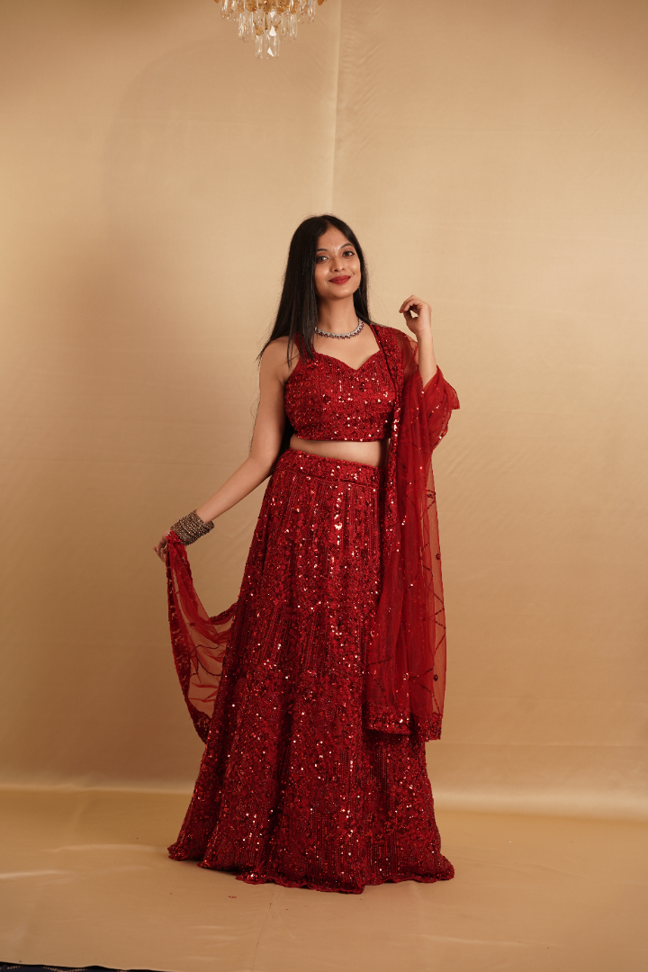 A dazzling red lehenga with intricate sequin embellishments and matching blouse. Perfect for festive occasions or weddings, this outfit exudes elegance and glamour.