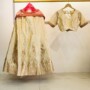 This cream-colored Banarasi lehenga features intricate gold floral embroidery with pink accents. The matching blouse has a tie-back design and embroidered sleeves. A beautiful fusion of traditional craftsmanship and modern style.