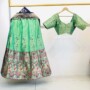 This vibrant green Banarasi lehenga features intricate floral embroidery along the hem, complemented by a matching blouse with colorful patterns. The blouse has a chic, structured design with short sleeves. A beautiful blend of traditional Banarasi craftsmanship and contemporary style, perfect for festive occasions.