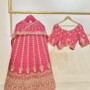 This stunning pink lehenga is adorned with delicate golden embroidery and intricate floral designs. A beautiful choice for traditional celebrations or special events.