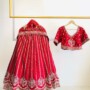 A regal red lehenga with intricate gold embroidery and rich detailing. The matching blouse adds a contemporary twist, making this outfit perfect for royal-themed celebrations.