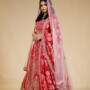 A traditional red lehenga with stunning gold threadwork and intricate patterns, making it the perfect choice for weddings and grand celebrations.