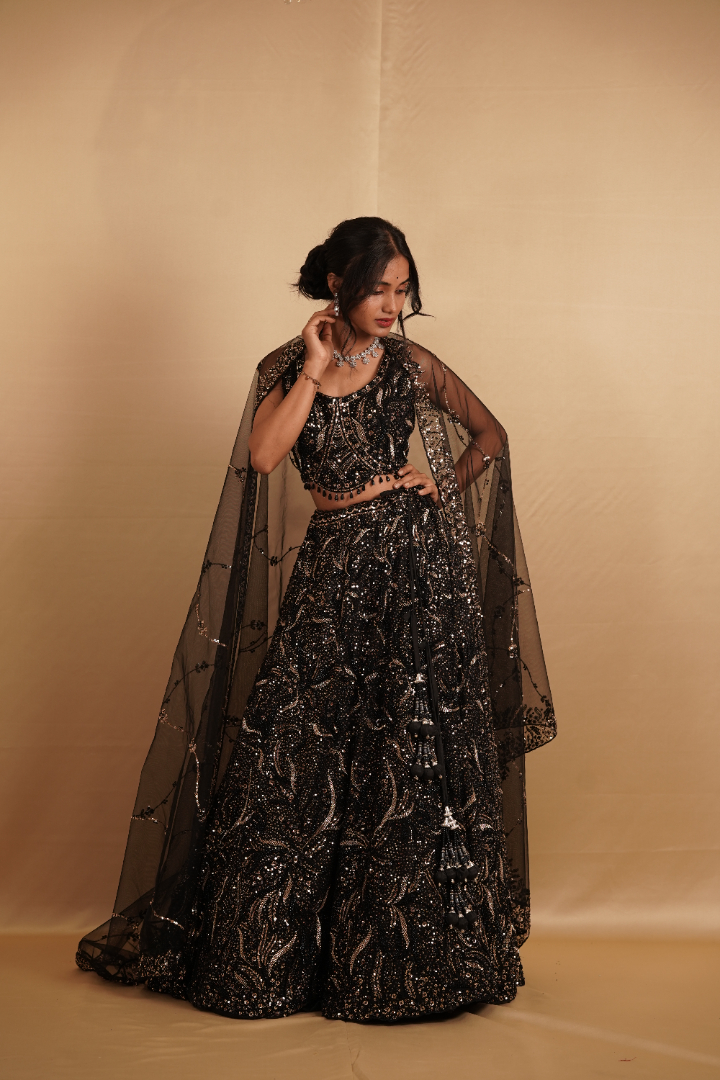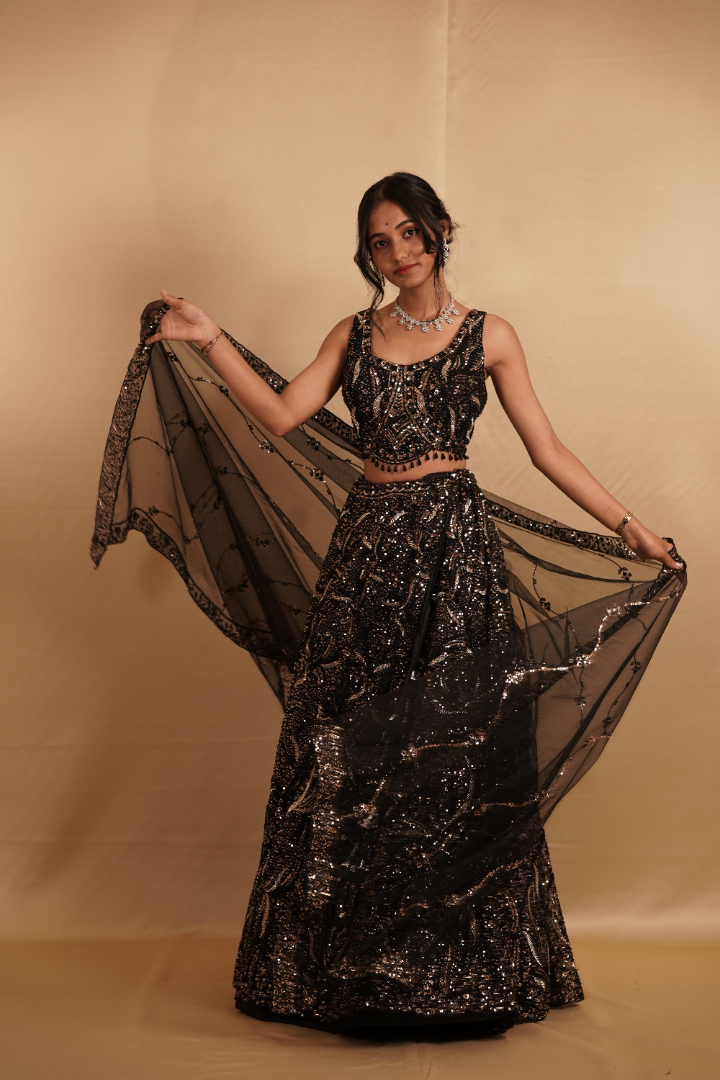 Step into the spotlight with the Midnight Constellation Lehenga, a masterpiece designed for high-glamour evening celebrations. This three-piece ensemble features a deep obsidian base adorned with a breathtaking fusion of sequin-work and metallic embroidery, meticulously arranged to mimic the shimmering dance of stars against the night sky.